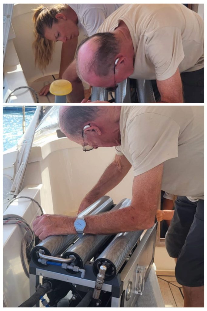 De watermaker deed het nog prima, maar hij lekte een heel klein beetje, ergens uit de hogedrukunit. Ook omdat het apparaat inmiddels al meer dan 15 jaar oud is hebben we besloten om niet verder op zoek te gaan naar het lek maar de hogedrukunit in het binnenste van de watermaker te vervangen door een nieuwe. Het was wel nodig om daarvoor de watermaker uit te bouwen. We hebben hem in de kuip te geplaatst om er goed bij te kunnen. Dat is geen kleine klus, vooral omdat het apparaat heel compact is ingebouwd en het ook behoorlijk zwaar is. Gelukkig was Denise weer in de buurt, die niet niet alleen handig maar ook sterk is. Samen hebben we in een dag de watermaker uitgebouwd, de hogedrukunit vervangen en het apparaat weer teruggeplaatst. Hij lekt niet meer. De nieuwe unit blijkt een stuk soepeler te lopen en minder lawaai te maken. We zijn er blij mee.