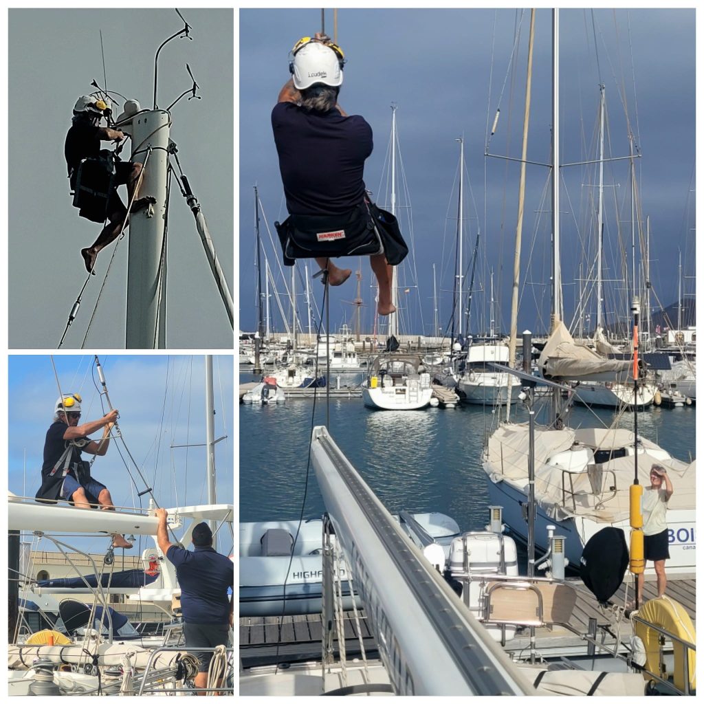 Alles leek in orde, maar voor de zekerheid hebben het want ook door een professionele “rigger” laten controleren, die toevallig onze buurman in de haven is. Hij twijfelde aan de montage van de isolatoren in de achterstag. Die isolatoren zijn ervoor omdat de achterstag ook functioneert als antenne voor de kortegolfzender. Geen groot risico, zolang we onder de kust blijven varen, maar voor een lange tocht over de Atlantisch Oceaan nemen we liever geen enkel risico. Dus hebben we besloten om de achterstag te laten vervangen door een nieuwe.